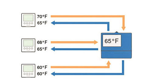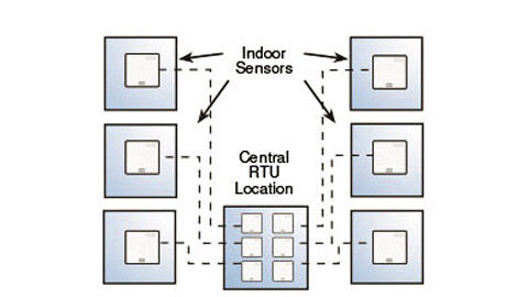 Remote sensing allows the end user to control the indoor temperature of several zones from one central location. Multiple indoor sensors located throughout the building measure the zone temperatures. Each sensor is connected to a Room Temperature Unit (RTU) which controls the desired zone indoor temperature.