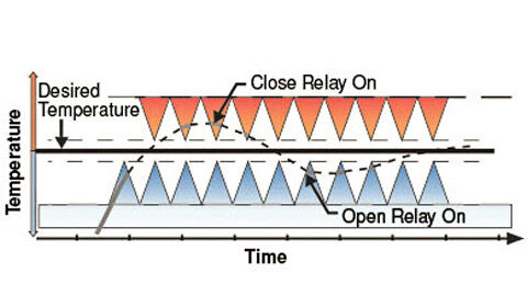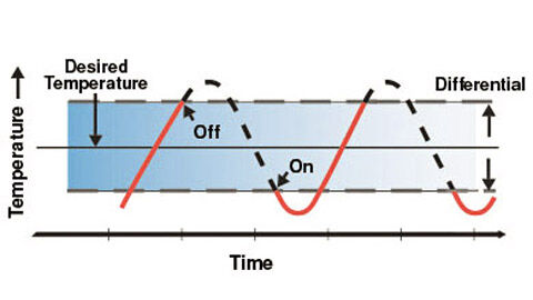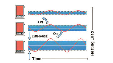 An on/off device, such as a boiler, must be operated with a differential in order to prevent short cycling. When the supply water temperature drops below the bottom rail of the differential, the device is turned on. The device is then kept on until the temperature reaches the upper rail of the differential. If the differential is set too wide, there can be large temperature swings, and if the differential is set too small the device short cycles and operates inefficiently.