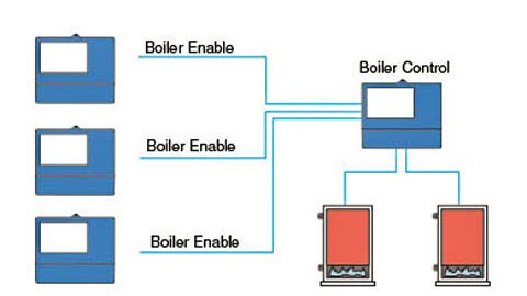 When multiple controls in a single system try to operate the boiler(s) simultaneously, short cycling can occur. For the most efficient boiler operation, only one control should operate the boiler(s). All of the remaining controls should send a simple on / off signal to the boiler control. This function when used with a proper boiler control improves the system operation by preventing short cycling of the boiler(s). This also allows for easy integration of controls into existing systems.