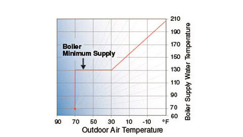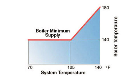 Many systems, such as radiant heating, use a mixing device to reduce the system supply water temperature. The boiler in these systems should be operated at the minimum allowable water temperature in order to reduce standby losses. As the heating load increases and the mixing device is fully open, the boiler temperature should be increased to satisfy the heat requirement. This function provides higher system efficiencies and better controllability by operating the boiler at the proper temperature.