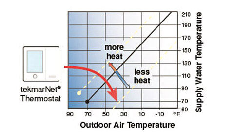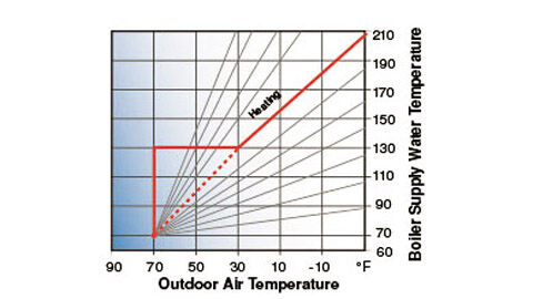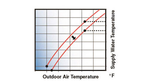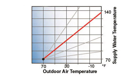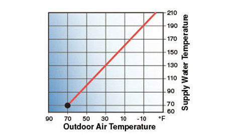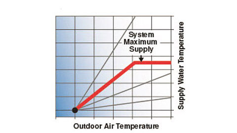 In order to properly control a hot water heating system, the heat supplied to a building must equal the heat loss from the building. The heat loss is dependent on the outdoor temperature. It is therefore necessary to reset the supply water temperature based on the outdoor temperature. The ratio at which the water temperature increases as the outdoor temperature decreases is the heating curve. Outdoor temperature reset improves comfort by limiting indoor temperature swings, and provides higher energy savings by minimizing distribution and boiler stack losses.