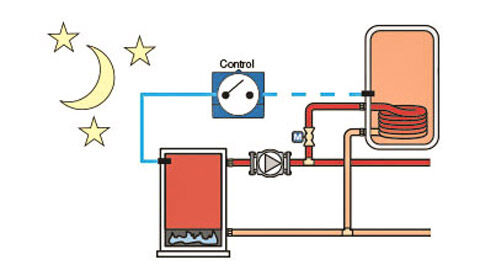 During the night, or when people are not within the building, energy can be saved by lowering the DHW tank temperature. This is achieved by ignoring the DHW call for heat during the setback period. Energy savings is obtained through lower heat losses from the tank as well as by preventing inefficient boiler operation during periods of low DHW demand.