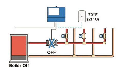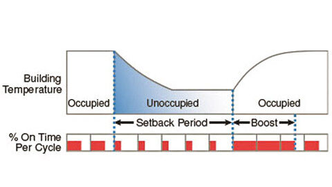 A boiler is controlled by turning it on and off. In applications where outdoor reset is used, the boiler temperature can be lowered based on the outdoor temperature. Resetting the boiler temperature is limited by the boiler manufacturer’s minimum recommended operating temperature and allows water temperature reset for about 50% of the heating season. This function improves comfort by supplying the right amount of heat, and provides higher energy savings by minimizing distribution and boiler standby heat losses.