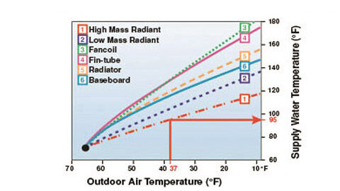 A characterized heating curve is a more accurate method of outdoor reset. Each type of terminal unit delivers heat into a building with different proportions of radiation, natural convection and forced convection. With a characterized heating curve, the control takes into account both the outdoor temperature and the type of terminal unit in order to determine the best water temperature for the system.