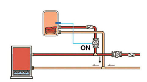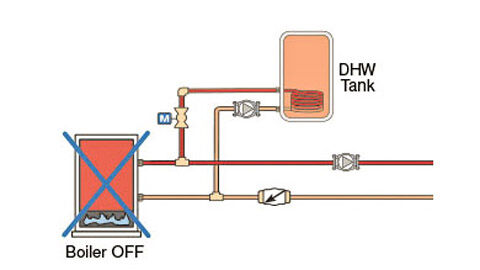 DHW priority allows the DHW tank to recover faster by temporarily suspending the heat supply to the heating system. All of the available heat is provided to the DHW tank for a period of time. This function provides more comfort by ensuring faster DHW pick up times and increases system efficiency by often allowing the use of a smaller heat source.