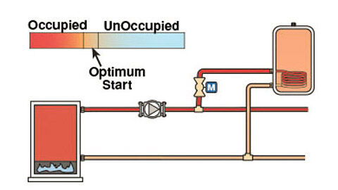 To ensure that the DHW tank is up to temperature after the DHW Setback period the control must raise the tank temperature before the setback period ends. This can be accomplished automatically by using a control that has an optimum start / stop function. This function increases comfort by ensuring the DHW tank is up to temperature at the beginning of the occupied period.