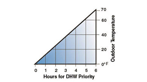 If DHW priority is selected then heat to the heating system is stopped during a call for DHW. At cold outdoor temperatures the building may freeze up when there is a long call for DHW. In order to prevent this, the control must be able to override the priority and simultaneously operate the heating system and the DHW. The maximum time allowed for DHW priority should decrease as the outdoor temperature drops. This function provides more comfort by preventing large temperature drops in the space during DHW operation.