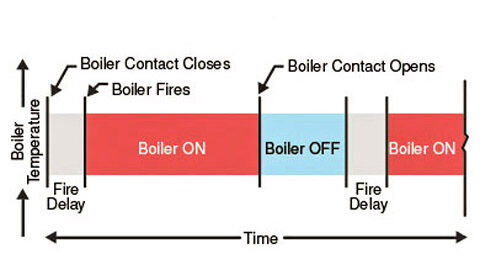 Most boilers have built in safety delays before the burner is allowed to fire. The fire delay function allows a boiler staging control to account for the delay between the time that the control signals the boiler to operate and the burner actually fires. By taking into account the delay time, the control can more accurately determine the required number of stages to turn on. This function improves the efficiency of the system by minimizing short cycling in a multiple boiler system.
