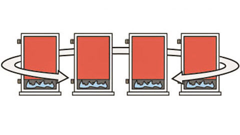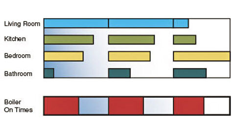 In typical zoned systems, the thermostats operate on a stand-alone basis. This means that a zone turns on and off as required without any regard for other zones. The net effect is random operation of the zones causing short cycling of the heat source. tekmarNet®4 thermostats communicate to ensure that their cycles are synchronized. Energy is saved by ensuring that all zones that require heat operate at the same cycle, therefore reducing short cycling of the boiler.