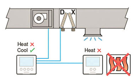 Heating and cooling interlock prevents the system from heating and cooling simultaneously. When the heating room temperature units (RTU) have been satisfied for a period of time, the control allows for the cooling unit to operate. If a cooling RTU is used, the control operates the cooling unit to maintain space temperature. This function simplifies external wiring, and prevents inefficient system operation.