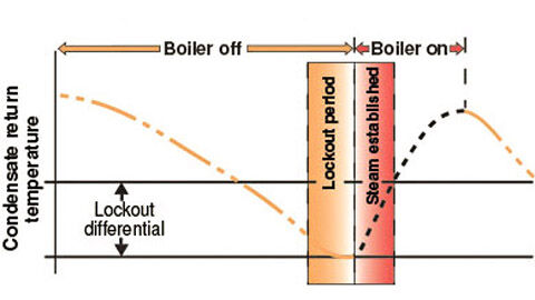 In order to increase the efficiency of a steam system, a Lockout or cool down period before each heating cycle can be used. The lockout differential ensures that the condensate temperature drops before turning the boiler on for the next cycle. This increases the efficiency of the system by removing the latent heat from the steam remaining in the heating system after the boiler shuts down.