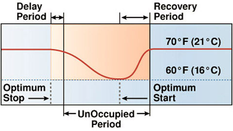 When a setback schedule is in effect, the building experiences delays in dropping down its temperature at the beginning of the setback period, and increasing its temperature at the end of the setback period. The optimum start/stop function learns the response of the system in order to calculate a start time for the heating system so that the building is warmed up when the occupied period begins. The optimum start /stop function increase the efficiency of the system and provides more comfort.