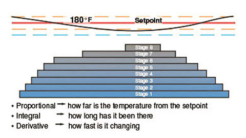 To provide proper boiler staging and accurate boiler supply temperatures, PID (Proportional, Integral, Derivative) control logic should be used. With PID control logic, the number of boilers fired depends on how far the boiler temperature is below the setpoint, how long the error has persisted, and how fast it is changing. This function provides greater boiler plant efficiency and also prevents water temperature droop that is commonly seen on proportional staged systems.