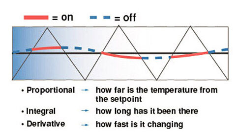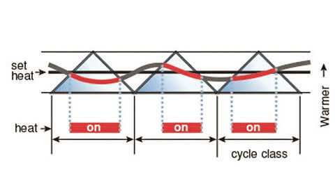 PWM is an on/off action that differs from an on/off differential by changing the length of the “on” time based on how much the actual temperature differs from the desired. The heating device is operated based on “how much” heat is required. This function prevents overshoots and undershoots in systems with large thermal mass such as pools or slabs.