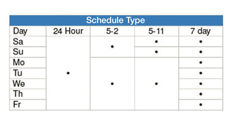 Thermostat scheduling allows the room temperature to be automatically setback during the heating season, or set up during the cooling season. Up to 4 events per day may be programmed in order to increase the energy savings of the system. For maximum flexibility, a 24 hour, 5-2 (weekdays and weekend), 5-1-1, (weekdays, Saturday and Sunday), or 7 day schedule may be programmed. Programmable schedules can provide energy savings of 10 to 15%.