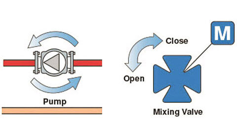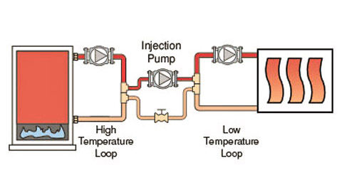 The full range of temperatures required through a heating season can be provided with a non-condensing boiler together with a mixing device. The mixing device provides different water temperatures based on the outdoor temperature throughout 100% of the heating season, and it is not limited by the boiler manufacturer’s minimum recommended operating temperature. This function provides more comfort by reducing indoor temperature swings and increases system efficiency by reducing system distribution losses.