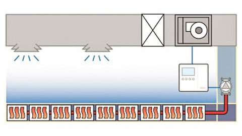 Radiant base load uses two-Stage operation to speed up the response of a radiant system. The thermostat operates the first stage of heat to operate the radiant system. The second stage operates a faster response heating terminal, such as a fan coil, to fine tune the air temperature. The end-user can now experience the comfort of radiant floor heating while having the benefit of a faster response heating system.