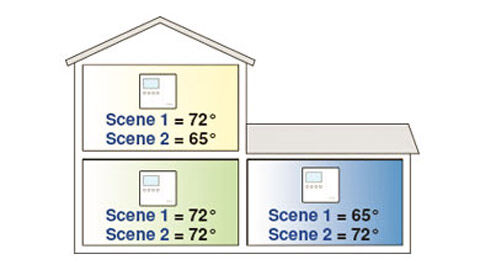 A scene is a state that all zones react to. Each zone may be selected to react in a particular way during a scene. This allows for all the zones to be adjusted to a particular temperature during a specific scene. Building owners can easily select a desired scene from one thermostat and automatically adjust the set-points in all other zones according to the selected scene.