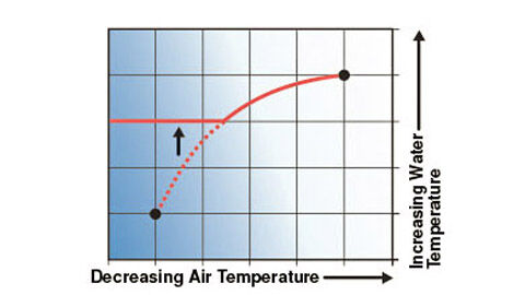 In snow melting systems the slab sensor is normally an inch below the slab surface. When the outdoor temperature suddenly drops, the sensor does not register this change immediately and surface freeze up could occur. The heat input to the slab must therefore increase as the outdoor temperature drops in order to provide a constant slab surface temperature.