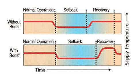 By increasing the supply water temperature during the recovery period before the end of the setback schedule, faster pick up times can be achieved. This allows for longer setback periods and therefore more energy savings can be obtained. This function works in conjunction with indoor temperature feedback in order to determine the correct amount of water temperature boost.
