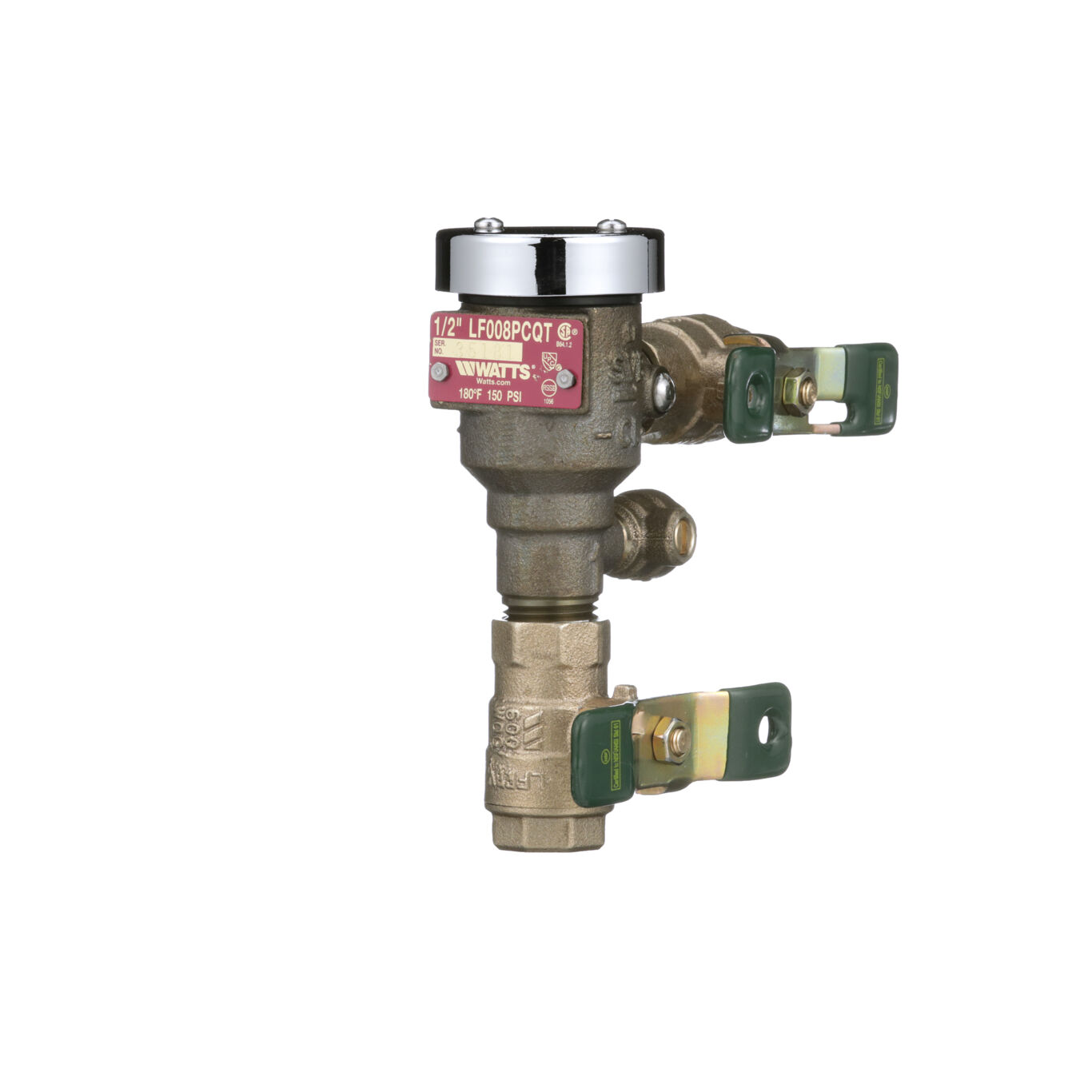 Series LF008PCQT Lead Free* Anti-Siphon, Spill-Resistant, Vacuum Breaker Backflow Preventers are designed to prevent the reverse flow of polluted water from entering into the potable water supply due to backsiphonage on indoor point-of-use applications. They have a Lead Free* cast copper silicon alloy body construction, thermoplastic check and float assembly valve, stainless steel springs, tee handles and a molded diaphragm separating the air inlet from the potable water supply to prevent spillage. Series LF008PCQT is ideal for indoor use on machines or equipment in general plumbing applications. Maximum Working Pressure: 150psi (10.34 bar), Minimum Working Pressure: 8psi (55.2 kPa).