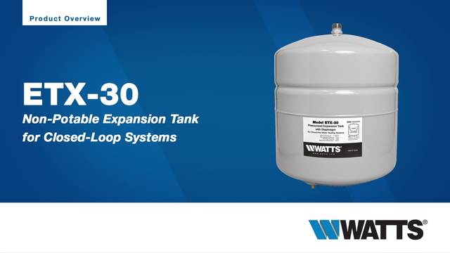 Series ETX, ETSX Non-Potable Water Expansion Tanks are for use in commercial and residential closed loop hydronic heating system piping to control the thermal expansion of hot water and maintain system pressure below the relief setting of the relief valve. The pre-pressurized steel tank features a durable expansion membrane that prevents contact of the water with the air in the tank. This rugged diaphragm minimizes loss of the air change and ensures long and trouble-free life for the system. Model ETX mounts to supply piping and Model ETSX is free standing. Available in a variety of models and sizes. Maximum Pressure: 75psi (5.3 bar) for ETX and 100psi (6.9 bar) for ETSX.