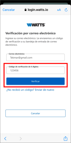 - Compruebe si su bandeja de entrada de correo electrónico contiene un correo electrónico de Watts con un código de verificación